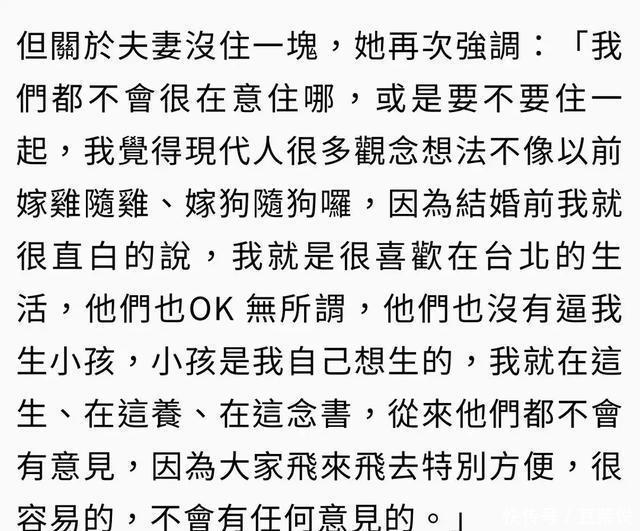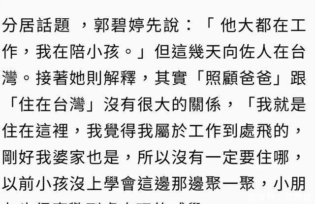 “其实也没有逼我生过小孩,小孩是我自己想生的,然后在这里(台北)生,在这里养,在这里念书,从来都不会,他们都不会有任何意见” 郭碧婷婚后还生活在台北,这是她刚结婚的时候就跟婆家坦白过的事,所以现在她和孩子住台北,向佐跟她们分居。