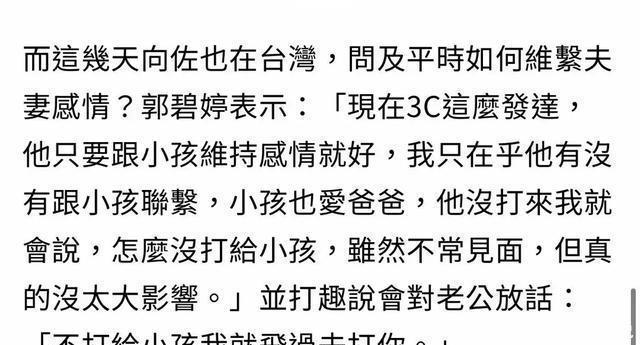 被问到如何维系夫妻感情,郭碧婷对此表示只要向佐和孩子维持感情就好了,她只在乎老公有没有和孩子沟通,所以如果向佐没有天天打电话过来,她都会打电话过去,还玩笑表示如果让小孩难过,她一定会飞过去打向佐。