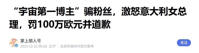 信源来源:掌上丽人号 2023-12-21“宇宙第一博主”骗粉丝,激怒意大利女总理,罚100万欧元并道歉